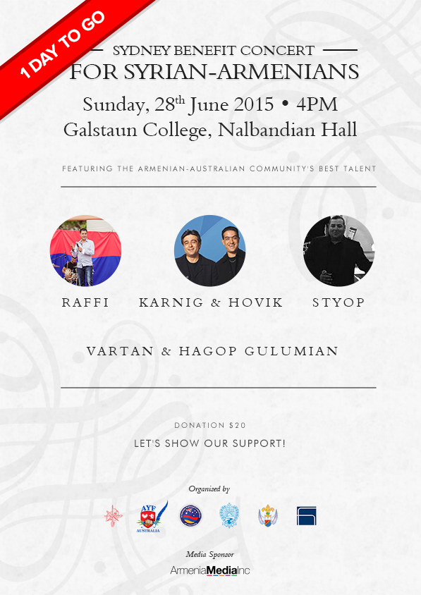 Syrian-Armenian Appeal (read more on this by clicking here) at a Benefit Concert being held at the Galstaun College Nalbandian Hall on Sunday, 28th June 2015.