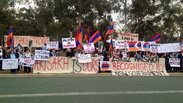 Քանպէրա - Ուրբաթ 8 Ապրիլ 2016ին Աւստրալիոյ մայրաքաղաք Քանպէրայի մէջ աւելի քան 250 հայորդիներ հաւաքուած էին Ազրպէյճանի դեսպանատան դիմաց բարձրացնելու իրենց բողոքի ձայնը Լեռնային Ղարաբաղի Հանրապետութեան մէջ կատարուած անմարդկային արարքներուն դէմ:
