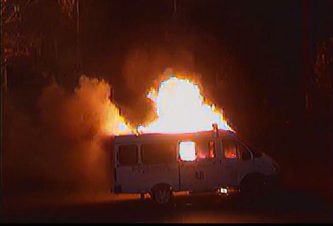 Մինչ այդ, պարեկապահակային ծառայութեան գունդի տարածքին մէջ երրորդ փոխադրամիջոց մը հրկիզուեցաւ: Դիմատետրի իր էջին վրայ այս մասին գրած է Հայաստանի ոստիկանութեան հասարակութեան հետ կապերու եւ լրատուութեան վարչութեան պետ Աշոտ Ահարոնեան: Աւելի կանուխ Աշոտ Ահարոնեան յայտնած էր, որ զինուած խումբը հրկիզած է նաեւ գունդի ծառայողական <<Շեւրոլէ>> տիպի պասը: