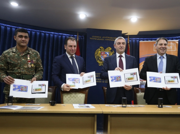 ԵՐԵՒԱՆ, <<Արմէնփրէս>> - Հայկական բանակի կազմաւորման 25ամեակին առիթով պաշտպանութեան նախարարութեան մէջ հրապարակուեցաւ եւ շրջանառութեան մէջ դրուեցաւ երկու նոր դրոշմաթուղթ՝ Հայաստանի պաշտպանութեան նախարար Վիգէն Սարգսեանի, փոխադրութեան, կապի եւ տեղեկատուական արհեստագիտութեան նախարար Վահան Մարտիրոսեանի, <<Հայփոստ Թրաստ Մենեջմեն>>չի գլխաւոր տնօրէն Խուան Փապլօ Գեչիջեանի եւ շարքային զինուոր, ապրիլեան քառօրեայ պատերազմի մասնակից, ատրպէյճանական ուղղաթիռը խոցած Նարեկ Մալխասեանի կողմէ: