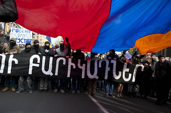 The mostly young protesters waving Armenian national flags and holding posters denouncing Putin and President Serzh Sarkisian marched through the city center to demand that Armenia stay away from the union. They ignored police warnings that the rally was not sanctioned by the municipal authorities.