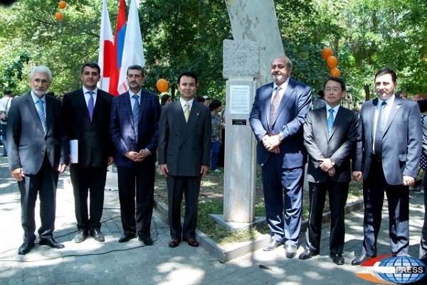 Japanese and Armenian officials in Yerevan unveil a memorial to the nuclear bombing of Hiroshima. June 25, 2014. (Photo: Armenpress)