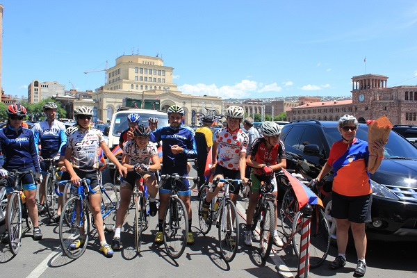 Riders from the United States included Jamie Kolar, a Los Angeles firefighter medic and Birthright participant who founded Aid to Armenia and spent a year on sabbatical teaching the latest first aid techniques to medics, schools, and village residents in Armenia; Roffi Petrossian from Seattle, also on a year of discovery in Armenia volunteering on environmental projects that included planting trees for Armenia Tree Project (ATP), video graphing for Civilinet, and applying to the American University of Armenia (AUA) program on Armenia’s Birds of Prey; and Anahid Yeremian, a particle accelerator physicist at Stanford and co-founder of the Support Committee for Armenia’s Cosmic Ray Division. The riders from the U.S. were joined by Rafael Paremuzyan, a physicist at YerPhI, and by the junior riders from the Armenian cycling team, including the two-time world junior silver medalist Mher Mkrtchyan. Coordinating the more than 15 riders and 4 support personnel was the ride leader, world-renowned master cycling trainer Albert Soloyan.