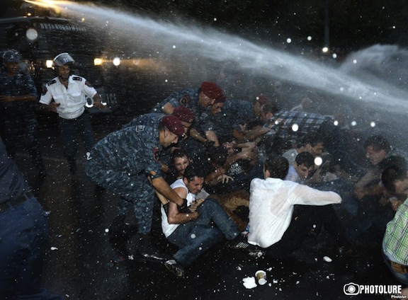 The protesters insisted that their actions were peaceful and demanded that President Serzh Sarkisian revoke the decision made by state regulators to raise electricity prices by 16 percent beginning August 1.