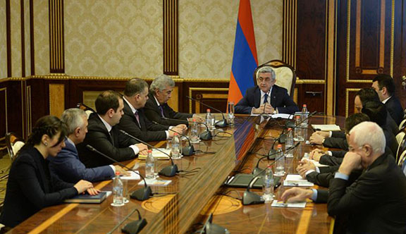 President Serzh Sarkissian meets members of a presidential commission on constitutional reform, Yerevan, 13 March 2015 (Source: RFE/RL)