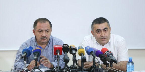 ARF parliamentary faction leader Armen Rustamian (right) and secretary Aghvan Vartanian (left) during a press conference on Monday