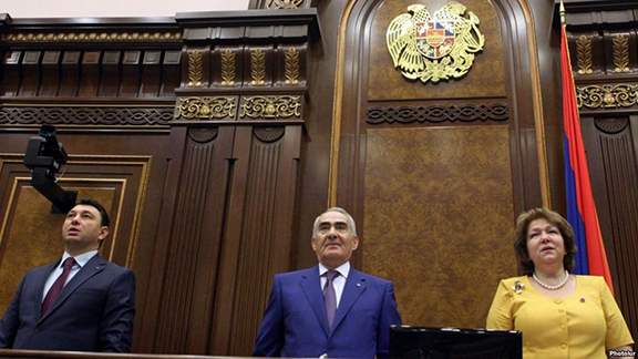Speaker Galust Sahakian (C) and two deputies open the fall session of the National Assembly on September 15 (Source: Photolure)