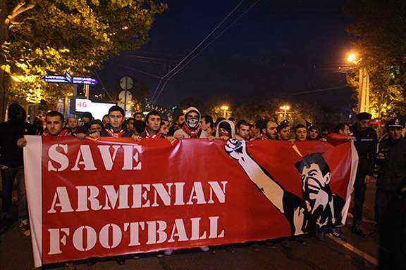 YEREVAN (ARMENPRESS)—Members of the First Armenian Front (FAF) football fan group marched toward the Football Federation of Armenia yesterday in Yerevan to express grievances with the federation’s handling of players and teams as well as to introduce certain demands.