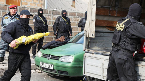 Armenia’s National Security Service officers empty arms after a raid on a house in suburban Yerevan Wednesday