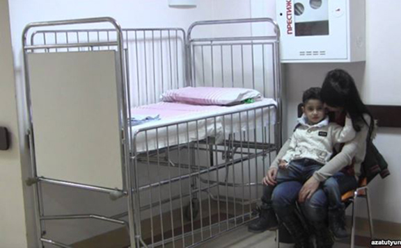 A child suffering from a respiratory virus and his mother wait in the hallway of Arabkir hospital. (Source: RFE/RL)