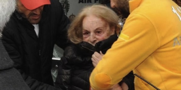 79-year-old Seta Demirci is being escorted to an ambulance after being found bound and gagged in her apartment in Istanbul