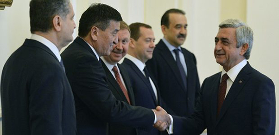 YEREVAN (ArmRadio)—Armenian President Serzh Sarkisian received today members of the Eurasian Intergovernmental Council and Chairman of the Board of the Eurasian Economic Commission, Tigran Sargsyan, who arrived in Yerevan to participate in the regular sitting of the Eurasian Intergovernmental Council.