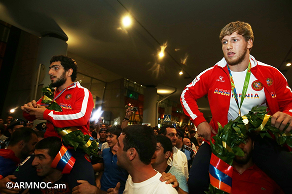 Athletes Artur Aleksanyan, Mihran Harutyunyan, Simon Martirosyan, Gor Minasyan were welcomed with chanting “Artur, Mihran, Simon, Gor champion” from all sides.
