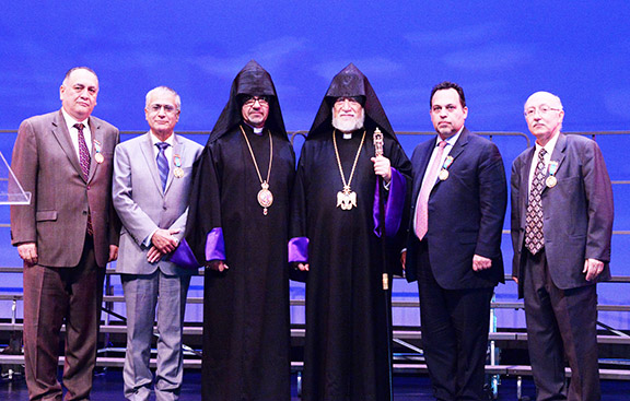 The Prelate thereafter announced that His Holiness was honoring four community members with the “St. Mesrob Mashdots” medal, and proceeded to give a brief synopsis of the realm of the honorees’ service: Sarkis Mahserejian – former teacher, former editor of “Aztag” Daily in Lebanon, currently the Western Prelacy Chancellor, creator of a series of children’s books, and service in cultural organizations. Dr. Viken Yacoubian – long-time educator, former principal of Pilibos Schools, ARF Bureau and Hamazkayin Central Executive member, and Armenian Cause activist. Vazken Madenlian: long-time educator, former Principal and Chamlian School, community activist, and in recent years has served diligently within the Syrian Armenian Relief Fund. Finally, John Kossakian: Former Principal of Ferrahian High School and current Principal of Marie Cabayan Elementary School, former administrator for ARS Central Executive, former editor of “Asbarez” Daily and “Horizon TV” director, community activist. One by one, the Prelate invited the honorees to the stage to receive the medal from His Holiness.