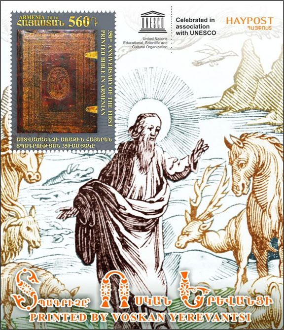 The stamp depicts the first printed Bible in the Armenian language and the souvenir sheet depicts the illustration from the Genesis Book of the Bible picturing the Creation of the World.