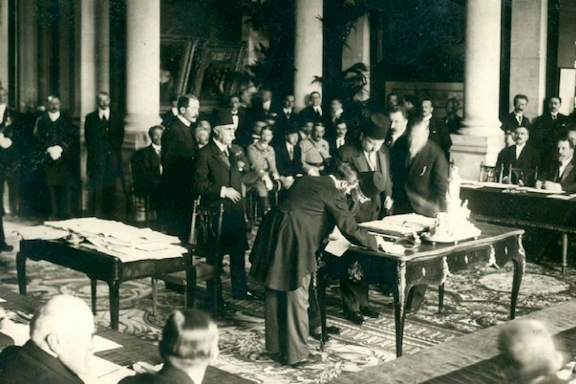 Representatives of the Ottoman Empire sign the Treaty of Sèvres on August 10, 1920