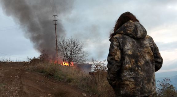 An Artsakh resident in Berdzor watches houses burn in the Lachin district before the handover to Azerbaijan (Tass photo)