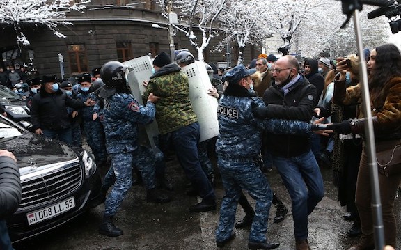 Armenia’s police on Thursday brutally beat, shoved and dragged opposition protesters, who were gathered at Armenia’s government building as they continued to demand the resignation of Prime Minister Nikol Pashinyan, blaming him for signing the November 9 agreement that ended the war, but stipulated the surrender of territories in Artsakh and Armenia to Azerbaijan.