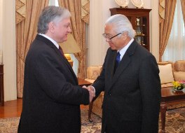 SINGAPORE: Armenian Foreign Minister Edward Nalbandian had a meeting with the President of the Republic of Singapore, Tony Tan Keng Yam. Greeting the Armenian Foreign Minister, the President said: “Armenians have left a deep trace in the history of our country and have contributed to its development.” He reminded that the first church in Singapore was built by Christian Armenians in the 19th century. Minister Nalbandian noted, in turn, that the visit of the Prime Minister of Singapore Lee Kuan Yew to Armenia in 2009 opened a new page in the history of relations between the two countries and voiced hope that the visit of the Armenian President to Singapore would give new impetus to the development of friendly cooperation. The interlocutors discussed the steps to be taken towards the development of bilateral ties, the perspectives of expansion of economic relations, collaboration in the field of investments and exchanged views on a number of issues on international agenda. The same day Minister Nalbandian held talks with his counterpart K Shanmugam. The Ministers discussed the preparation of the forthcoming visit of the Armenian President to Singapore. The parties discussed ways to promote economic and cultural cooperation between the two countries, and exchanged views on developments in their respective regions. Mr. Shanmugam also paid tribute to the contributions made by the Armenian community to Singapore's early development.While in Singapore, Mr. Nalbandian visited the Armenian Apostolic Church of St. Gregory the Illuminator, where he met with the Armenian community in Singapore.