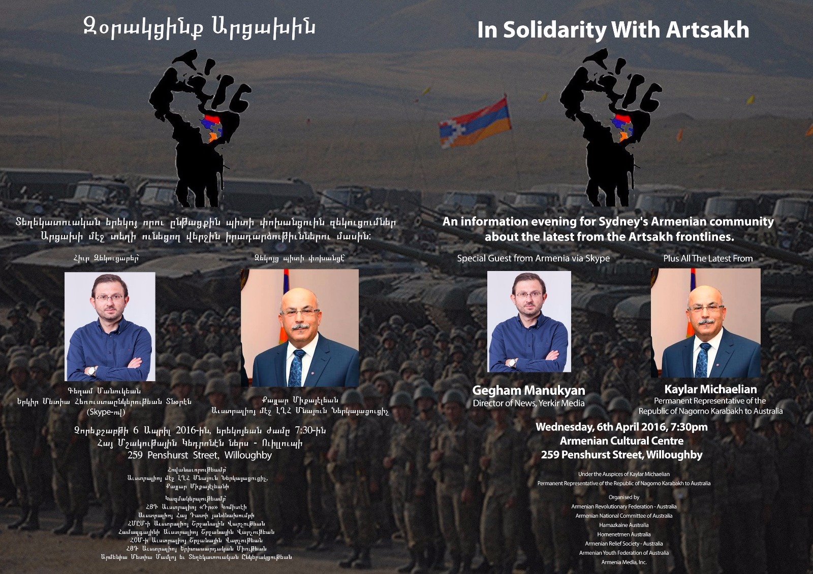 Կազմակերպութեամբ ՀՅԴ Աւստրալիոյ Դրօ Կոմիտէի եւ անոր ուղեկից միութիւններու այսօր՝ Չորեքշաբթի 6 Ապրիլին երեկոյեան ժամը 7:30ին Հայ Մշակութային Կեդրոնէն ներս տեղի պիտի ունենայ Զօրակցինք Արցախին խորագրով տեղեկատուական երեկոյ որուն ընթացքին Արցախի մէջ տեղի ունեցող վերջին իրադարձութիւններուն մասին մանրամասն զեկոյց պիտի փոխանցուի Աւստրալահայ գաղութին: