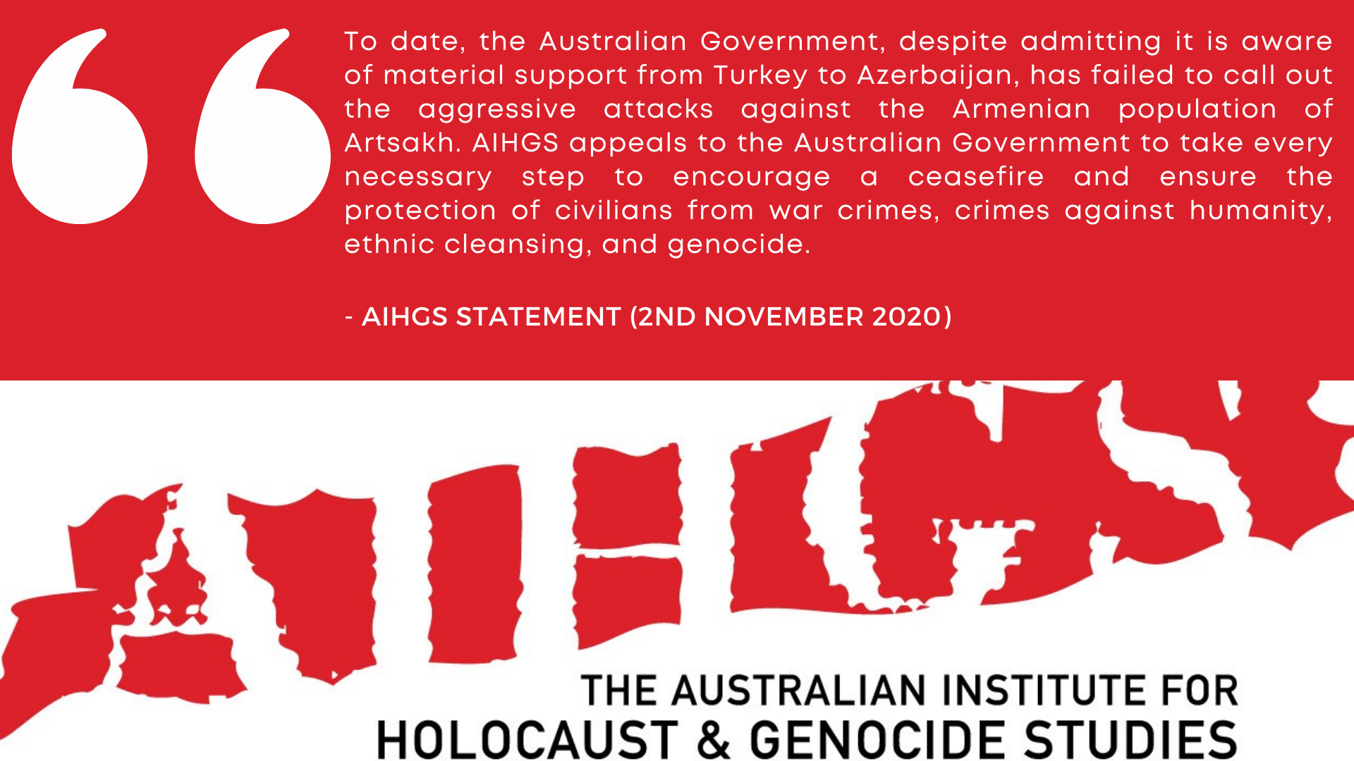 The full AIHGS statement can be read below:The Australian Institute for Holocaust and Genocide Studies (AIHGS) holds grave concerns about the conflict in Artsakh (Nagorno-Karabakh), in particular, an increasing risk of genocide against the indigenous Armenian population. AIHGS urges the Australian Government to take immediate action to prevent further atrocities and war crimes against a people who have already endured genocide and never seen justice.Since 27 September 2020, Azerbaijan, supported by Turkey, has launched aggressive attacks against the region of Artsakh, including attacks targeting Armenian civilians. War crimes and crimes against humanity have characterised Azerbaijan’s actions to date, with the use of long range missiles, drone strikes and cluster bombs, which are banned under international law.