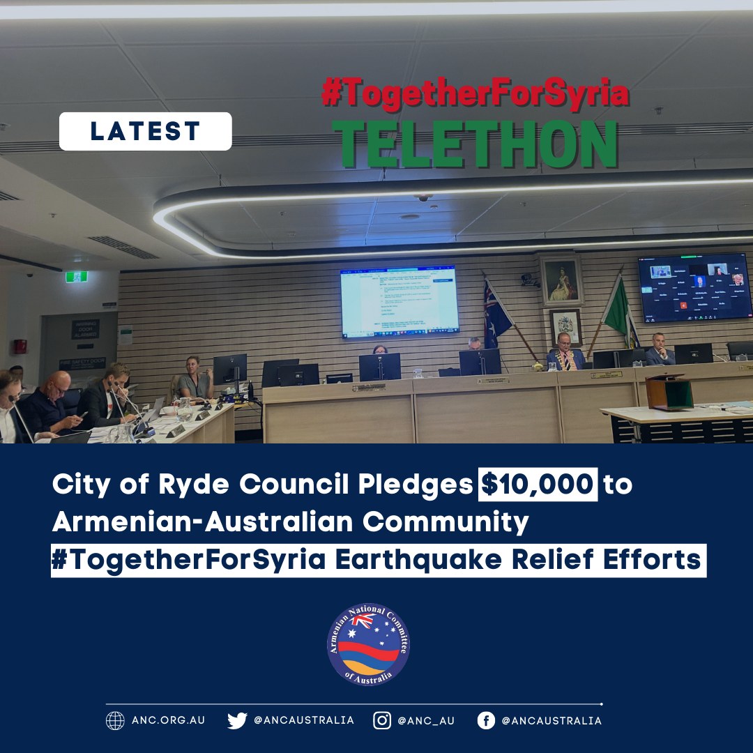 Երեքշաբթի, 28 Փետրուար 2023-ին, Սիտնիի Րայտ քաղաքապետարանի Աւստրալահայ քաղաքապետ Պրն Սարգիս Ետէլեանի ջանքերով Րայտ քաղաքապետարանը միաձայնութեամբ ընդունեց եւ որոշեց $10,000 տասը հազար տոլար նուիրել Աւստրալահայ համայնքի կողմէ կազմակերպուած #TogetherForeSyria երկրաշարժէն տուժած մեր Սուրիահայ համայնքին ի նպաստ դրամահաւաքին: