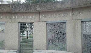 Հանուած են յուշարձանին վրայ տեղադրուած գրութեան տառերէն քանի մը հատը, ինչ որ անկարելի դարձուցած է կարդալ այդ գրութիւնը, որ կը վերաբերի Հայոց Ցեղասպանութեան ճանաչման: