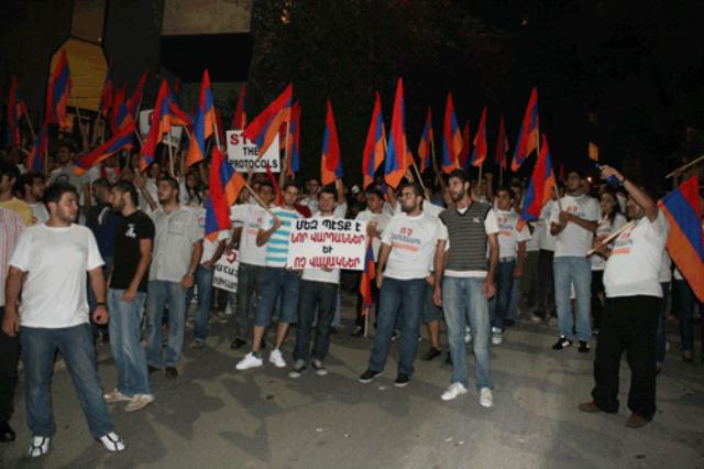 Հաւաքի մասնակիցները ցուցատախտակներով ու եռագոյն դրօշներով կ՛արտայայտէին իրենց բողոքը՝ դէմ կանգնելով հայ-թրքական նախաստորագրուած արձանագրութիւններուն։ Ցուցատախտակներուն վրայ գրուած էին շարք մը լոզունգներ, ինչպէս՝ <<Ո՛չ՝ հակահայ արձանագրութիւններուն>>, <<Ցեղասպանութիւնը սակարկութեան առարկայ չէ>>, <<Մեզի պէտք են նոր վարդաններ եւ ոչ վասակներ>>, <<Ո՛չ՝ նախապայմաններուն>> եւ այլն։