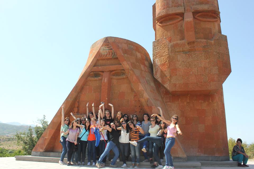 The girls with their new friends from Armenia and the diaspora in front of Mamig and Babig in Stepanakert