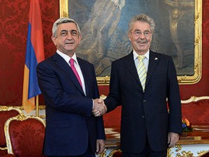 ԵՐԵՒԱՆ, «Արմէնփրէս».– Նախագահ Սերժ Սարգսեան պաշտօնական այցելութեամբ կը գտնուի Աւստրիա, ուր 11 Յունիսին կայացած է իր եւ Աւստրիոյ իր պաշտօնակիցին Հայնց Ֆիշըրի դռնփակ հանդիպումը, ապա՝ պաշտօնական պատուիրակութիւններուն մասնակցութեամբ ընդլայնուած կազմով բանակցութիւնները, որոնց աւարտին ստորագրուած են շարք մը ոլորտներու մէջ հայ-աւստրիական համագործակցութեան զարգացման առնչուած փաստաթուղթեր: Զրոյցին ընթացքին յատուկ կերպով անդրադարձ կատարուած է նաեւ Լեռնային Ղարաբաղի հիմնախնդիրին, որուն առնչութեամբ երկուստեք հաստատուած է, որ անիկա պէտք է լուծուի խաղաղ միջոցներով։