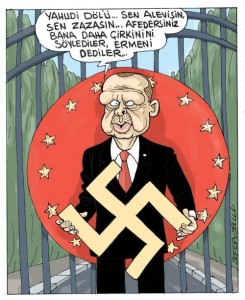 «Պիրկիւն»ի էջը-Էրտողան՝ ծաղրանկարիչ Սեֆեր Սելվի ակնոցով: Ծաղրանկարի գրութիւնը. «Հրեայի վիժուածք... Ալաուի ես, զազա ես... Ներեցէ՛ք, բայց ինծի աւելի գէշն ալ ըսած են՝ հայ անուանած են...»