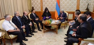 ԵՐԵՒԱՆ.– Նախագահ Սերժ Սարգսեան 23 Սեպտեմբերին ընդունած է Հայաստան-Սփիւռք 5րդ համաժողովին մասնակցելու նպատակով Հայաստան գտնուող սուրիահայ համայնքային կառոյցներու, կազմակերպութիւններու եւ հոգեւոր դասի ներկայացուցիչները՝ Մեծի Տանն Կիլիկիոյ կաթողիկոսութեան Բերիոյ թեմի առաջնորդ Շահան արք. Սարգսեանը, Սուրիոյ Հայ Աւետարանական եկեղեցիներու միութեան նախագահ դոկտոր Յարութիւն Սելիմեանը, ՀՅԴ ներկայացուցիչ Կարապետ Եուզպաշեանը, ՌԱԿի Հիւսիսային Սուրիոյ Շրջանային վարչութեան ատենապետ, ՌԱԿ Դատական գերագոյն ատեանի անդամ Լեւոն Պըլըքեանը, ՍԴՀԿ Հալէպի շրջանի ատենապետ Սարգիս Գաւլագեանը, ՀՅԴ ներկայացուցիչ, Բերիոյ Հայոց թեմի մամուլի քարտուղար, Սուրիոյ Հայ առաքելական, կաթողիկէ եւ աւետարանական համայնքներու ընդհանուր խօսնակ Ժիրայր Ռէյիսեանը: