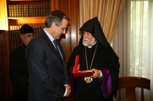 ԱԹԷՆՔ.- Երկուշաբթի, Սեպտեմբեր 22ի առաւօտուն, Արամ Ա. կաթողիկոս Աթէնքի մէջ հանդիպում ունեցաւ Յունաստանի վարչապետ Անթոնիս Սամարասի հետ: Հանդիպումին ներկայ էին Աթէնքի եւ համայն Յունաստանի արքեպիսկոպոս Երոնիմոս Բ., Յունաստանի Հայոց թեմի առաջնորդ Խորէն արք. Տողրամաճեան, Ազգային իշխանութեան անդամներ եւ վարչապետի խորհրդականներ: