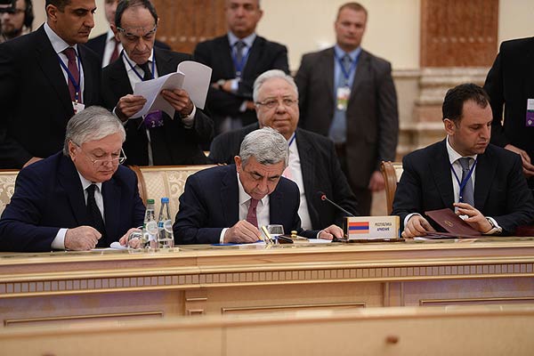 Ստորագրութեան արարողութենէն առաջ Հայաստանի նախագահը խօսք առաւ Եւրասիական տնտեսական բարձրագոյն խորհուրդի նիստին եւ ըսաւ. «Եւրասիական տնտեսական միութիւնը՝ հիմնուելով համընդհանուր եւ բոլորի համար հասկանալի սկզբունքների վրայ, այդ թւում՝ Առեւտրի համաշխարհային կազմակերպութեան նորմերի վրայ, բաց բնոյթ է կրում եւ ենթադրում է լիարժէք ու իրաւահաւասար համագործակցութիւն այլ ինտեգրացիոն միաւորումների եւ երրորդ երկրների հետ: