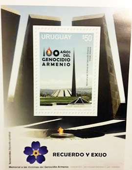 Նախաձեռնութեամբ Ուրուկուէյի մօտ ՀՀի պատուոյ հիւպատոս Ռուբէն Աբրահամեանի եւ մեր գաղութի առաջնորդ Յակոբ արք. Գըլնճեանի, Ապրիլ 7ին, երկրիս արտաքին գործոց նախարարութեան գլխաւոր հանդիսասրահին մէջ, ներկայութեամբ արտաքին գործոց նախարար Ռուտոլֆօ Նին Նովօայի, զբօսաշրջութեան նախարար Լիլիան Քէշիշեանի, Մոնթեվիտէոյի քաղաքապետ Աննա Օլիվերայի, ՀՀ դեսպան Ալեքսան Յարութիւնեանի, ինչպէս նաեւ երկրիս խորհրդարանէն բազմաթիւ պատգամաւորներու, Ուրուկուէյի մօտ դիւանագիտական ներկայացուցիչներու եւ մեծ թիւով ներկաներու, տեղի ունեցաւ Հայոց Ցեղասպանութեան 100ամեակին նուիրուած եւ Ուրուկուէյի նամակատան եւ հեռագրատան պետական կառոյցի կողմէ լոյս ընծայուած յատուկ դրոշմաթուղթի պաշտօնական ներկայացումը: