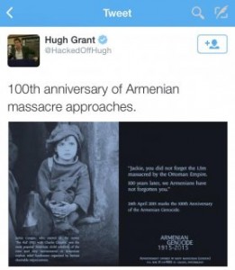 ԵՐԵՒԱՆ, <<Երկիր>>.- Հոլիվուտեան աստղ Հիւ Կրենթ Հայոց Ցեղասպանութեան մասին գրած <>ի իր էջին մէջ կը նշէ. <<Կը մօտենայ հայերու կոտորածներու հարիւրամեակը>>: