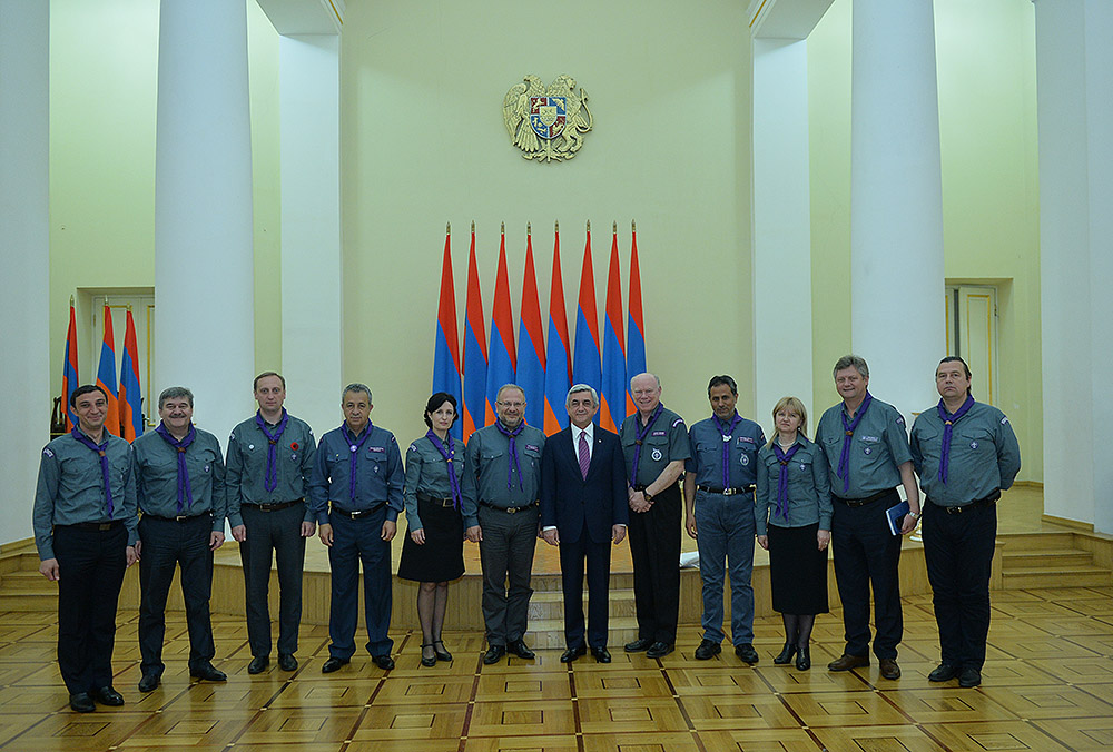 ԵՐԵՒԱՆ, <<Երկիր Մեդիա>>.– Հայաստանի նախագահ Սերժ Սարգսեան 11 Մայիսին ընդունած է Համաշխարհային սկաուտական շարժման պատուիրակութիւնը՝ շարժման գլխաւոր քարտուղար Սքոթ Թիրի գլխաւորութեամբ: Պատուիրակութեան մաս կը կազմէին Հայաստանի ազգային սկաուտական շարժման ներկայացուցիչները եւ Համաշխարհային կոմիտէի անդամները, որոնք 6-11 Մայիսին Հայաստանի մէջ գումարած են Համաշխարհային սկաուտական շարժման <<Եւրասիա>> տարածաշրջանի սկաուտական կոմիտէի նիստը: