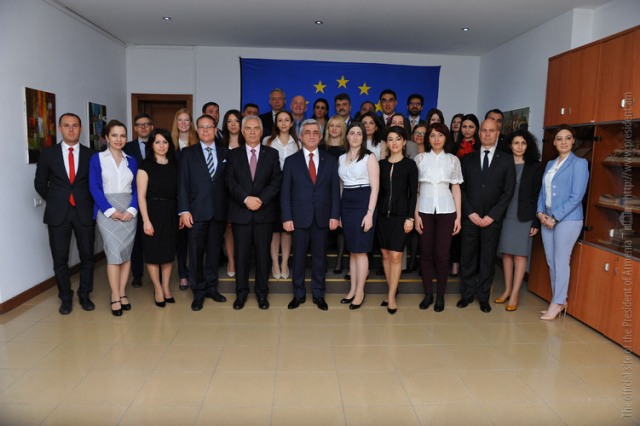 ԵՐԵՒԱՆ, <<Արմռադիօ>> - Նախագահ Սերժ Սարգսեան <<Եւրոպայի օրուան>> առիթով 7 Յունիսին այցելած է Հայաստանի Հանրապետութեան մօտ Եւրոպական Միութեան պատուիրակութեան: Հանրապետութեան նախագահը շնորհաւորած է Հայաստանի մօտ Եւրոպական Միութեան պատուիրակութեան ղեկավար, դեսպան Փեօթըր Սվիթալսքին, Եւրոպական Միութեան պատուիրակութեան ամբողջ անձնակազմը եւ ի դէմս անոնց՝ Եւրոպական Միութեան մեծ ընտանիքը <<Եւրոպայի օրուան>> կապակցութեամբ, մաղթելով խաղաղութիւն եւ բարեկեցութիւն: