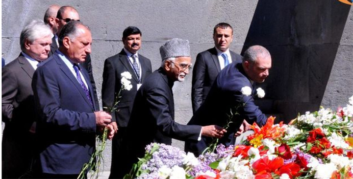 Այցի ծիրին մէջ Հնդկաստանի փոխնախագահը Ապրիլ 25ին այցելեց Ծիծեռնակաբերդ եւ յարգանքի տուրք մատուցեց Հայոց Ցեղասպանութեան զոհերու յիշատակին: Ան այցելեց նաեւ Ցեղասպանութեան թանգարան-հիմնարկ, գրառում կատարեց թանգարանի յուշամատեանին մէջ. <<Այս յուշահամալիրը վառ վկայութիւն է, որ հայերը տուժած են դաժան բռնութիւնէ: Միայն յենելով ազատութեան եւ հանդուրժողականութեան արժեքներու վրայ՝ մենք կրնանք խաղաղ ու ներդաշնակ ապագայ կառուցելու յոյս ունենալ>>, գրած է ան:
