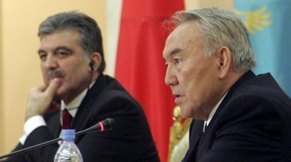 Kazakh President Nursultan Nazarbayev (foreground) with his Turkish counterpart Abdullah Gul (AFP photo)