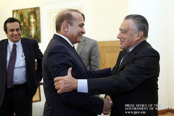 Armenian Prime Minister Hovik Abrahamian (left) greets Argentine-Armenian businessman Eduardo Eurnekian