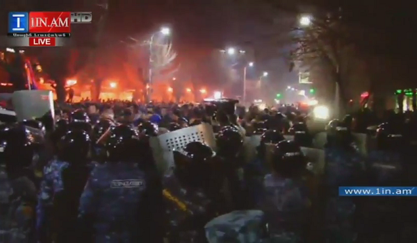 Protesters clashed with police in full riot gear in front of the Russian consulate in Gyumri. Jan. 15, 2015. (Photo: Arajin Live TV footage)