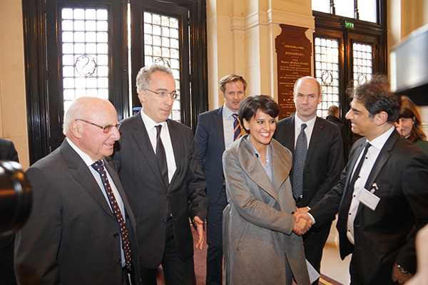 French Minister of Education and Research Najat Vallaud-Belkacem -- accompanied by historian Yves Ternon, President of the Academie de Paris François Weil, and President of the School for Advanced Studies in the Social Sciences Pierre-Cyrille Hautcoeur -- greets Mourad Papazian at the Sorbonne ahead of delivering a keynote speech to open an academic conference on the Armenian Genocide. March 25, 2015. (Photo: Nouvelles d'Arménie)