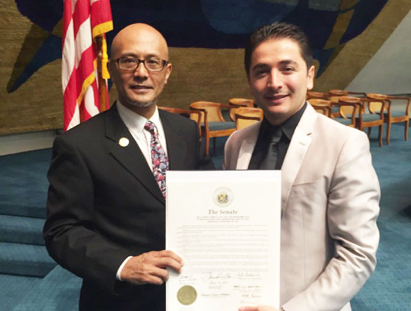 Hawaii State Senator Will Espero (left) and Artur Artenyan with a signed resolution recognizing the Armenian Genocide