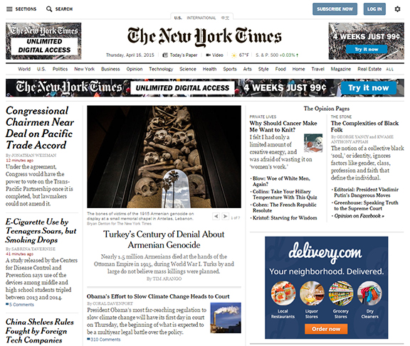 A screen capture of the home page of the New York Times on Thursday featuring a piece about the Armenian Genocide