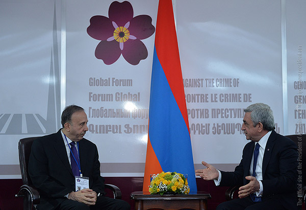 Al-Laham conveyed Syrian President Bashar al-Assad’s warm regards and best wishes to President Sarkisian and stressed that Syrians have a special attitude towards Armenia and the Armenian people. He noted that the participation of his delegation in the Yerevan forum bears witness to the fact that Syria recognizes the Armenian Genocide committed by the Ottoman Empire. Speaker al-Laham said that the global forum, titled “Against the Crime of Genocide,” is a good opportunity to mobilize the efforts of the international community and prevent the repetition of such crimes in the future.