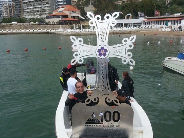 BEIRUT, Lebanon—Under the patronage of the Embassy of the Republic of Armenia in Lebanon, and the Armenian Genocide Centenary Central Committee of Lebanon, and His Holiness Nerces Bedros IXX, Patriarch of the Armenian Catholic Church in Beirut, a diving club owned by Antranig “Toni” Haddad, a descent of an Armenian Genocide survivor, organized the placement of an Armenian Genocide Memorial Cross beneath the sea on Sunday near Green Beach Resort, in the gulf of Junieh north of Beirut.