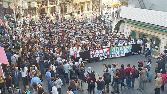Over a thousand demonstrators gathered at the Beyoğlu Tünel Square on Istiklal Street to voice their concern over the fate of the historic Armenian camp, including Peoples’ Democratic Party (HDP) municipal candidate Murad Mıhçı.