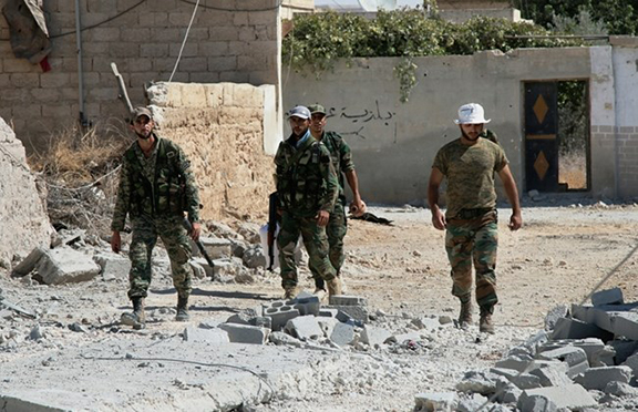 Syrian army soldiers walk in Achan, Hama province, Syria (Source: Alexander Kots/Komsomolskaya Pravda via AP)