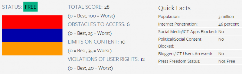YEREVAN (Public Radio of Armenia)—With a score of 28 Armenia is ranked as a “free country” according to the Freedom of the Net 2015 report released by Freedom House.